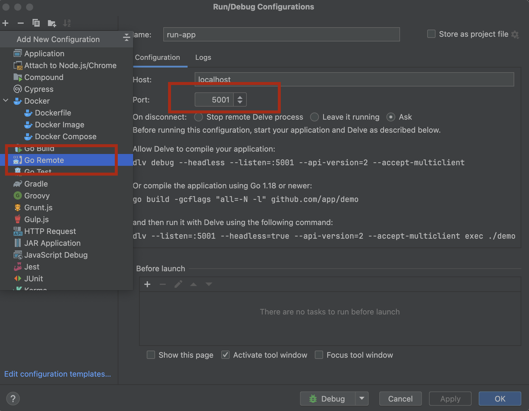 Create a Go remote Run Configuration and leave it as is. If you have modified the listening port in the dlv command, update it here to match (it doesn’t matter which port you choose, just make sure they match). Keep the host as localhost.